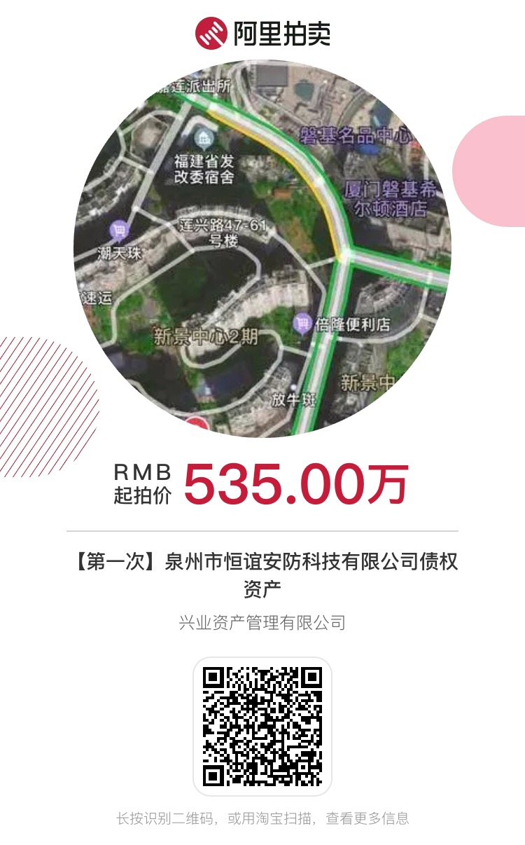二、标的物详情描述:截至本次转让的债权基准日2019年9月30日,泉州市恒谊安防科技有限公司债权金额5628796.70元(其中债权本金3299246.72元,利息2285319.98元,代垫费用44230.00元)。诉讼状态:已执行。